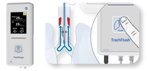 With the push of a button, the TrachFlush deflates the cuff and utilizes the ventilator air pressure during an inspiratory cycle, and re-inflates the cuff before the cycle completes.