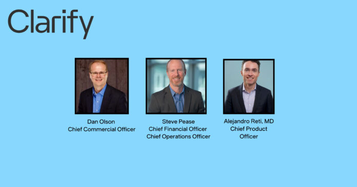 SAN FRANCISCO– Clarify Health, an award-winning healthcare data and analytics company, has expanded its executive leadership team to fuel the company’s strategic growth. The new executives include Dan Olson as chief commercial officer, Steve Pease as chief financial officer and chief operations officer, and Alejandro Reti as chief product officer. Collectively they bring decades of impactful healthcare and technology leadership in finance, operations, sales, product, and business development.