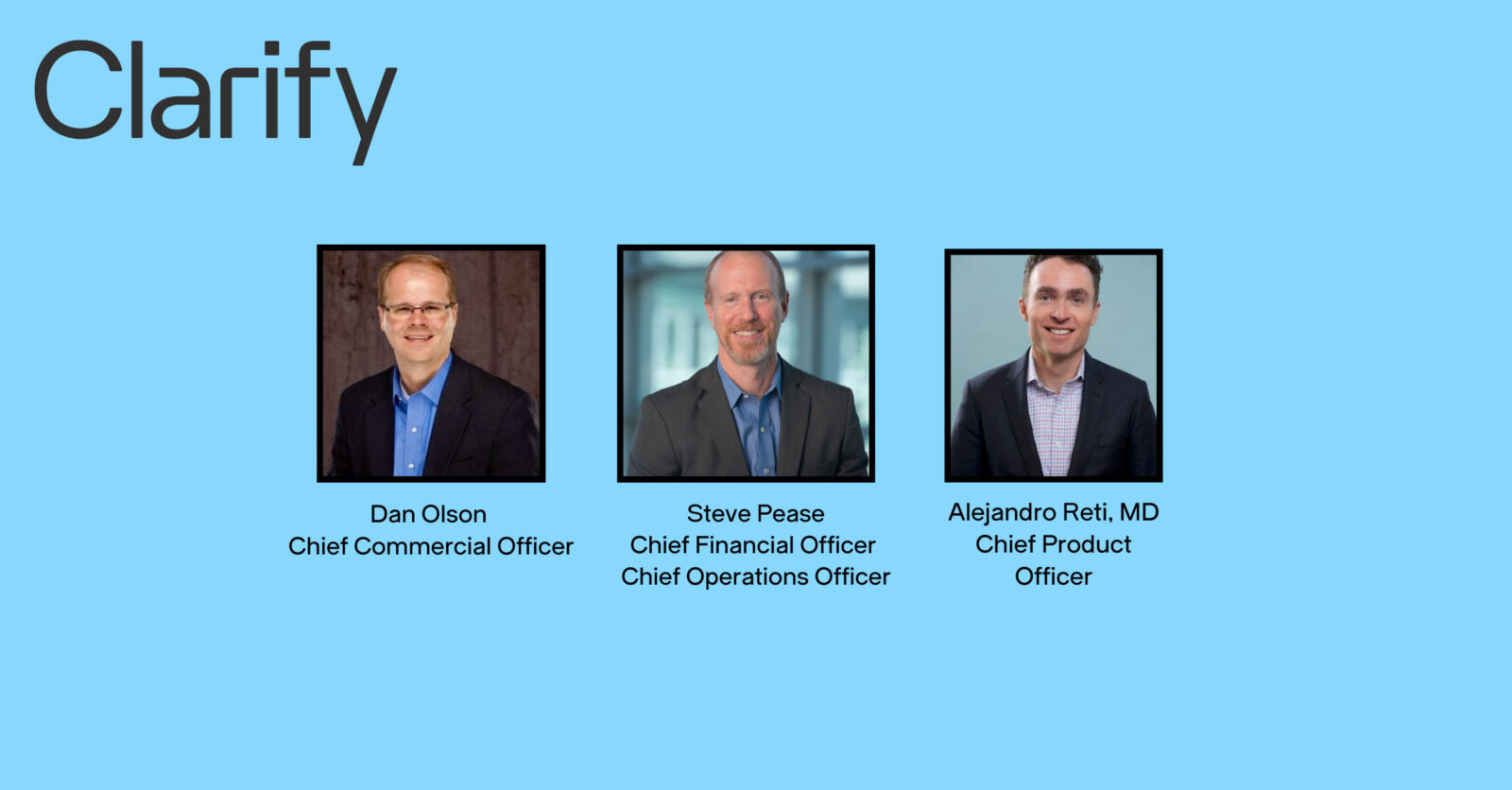 “I am thrilled to welcome Dan, Steve, and Alejandro to Clarify. Their combined expertise strengthens our foundation and reinforces our commitment to innovation and growth,” commented Clarify Health CEO Terry Boch. “They have joined us at a critical time as we re-launch our streamlined, ROI-driven solutions and bold branding that reflects our dual focus, helping our customers do well while doing good. Together, we aim to blueprint a healthcare system that benefits everyone.”