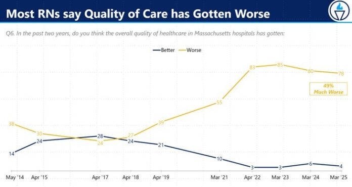 The survey, conducted by Beacon Research and based on responses from over 500 registered nurses—primarily non-union—paints a stark picture of life inside the state’s hospitals. Nearly 80% of nurses say the quality of hospital care has declined over the past two years, with half reporting that conditions have become “much worse.” This marks a persistent decline that began during the pandemic and has yet to recover to pre-COVID levels.