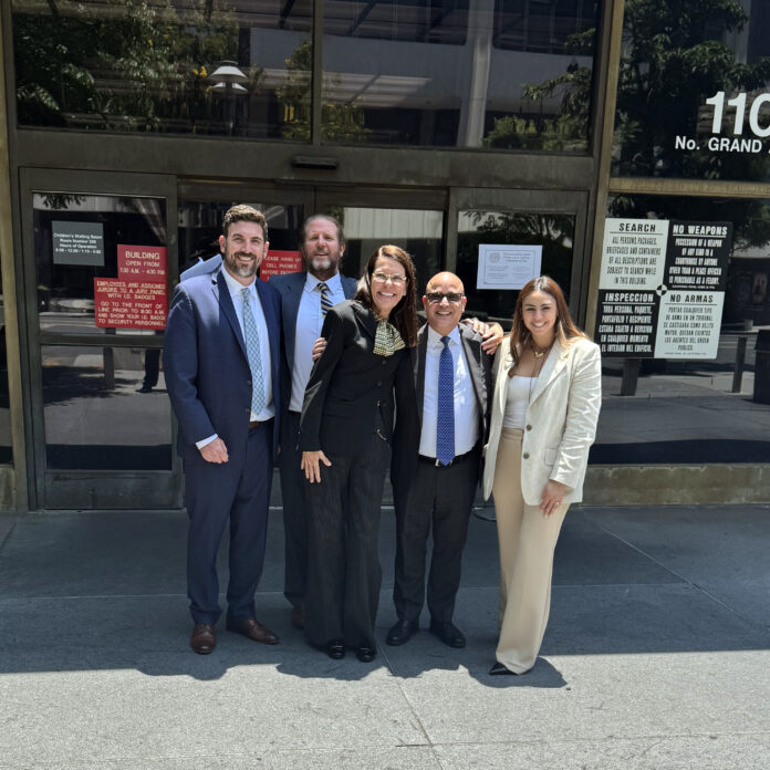 As pictured, from left to right: Brennan Hershey, Johnny Rundell, Nancy Valla, David deRubertis, and Leslie Gomez-Garcia after securing landmark $27.5 million jury verdict against Dignity Health in whistleblower retaliation case.